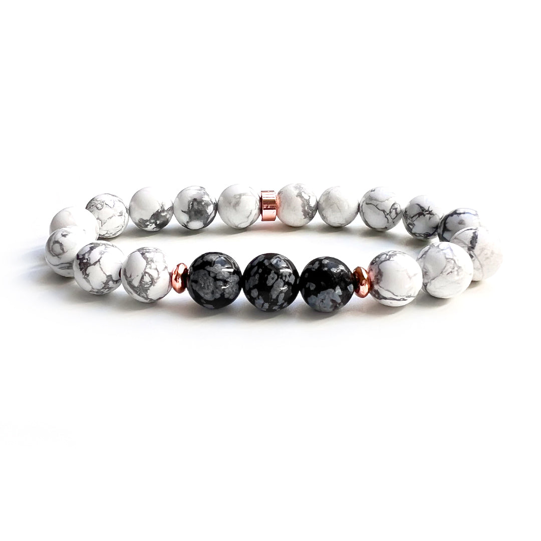 ZenCity Signature bracelet - Howlite & Snowflake Obsidian crystals with rose gold.